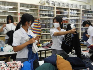 家庭クラブでは弦月祭で「届けよう 服のチカラプロジェクト」に取り組みました。このプロジェクトは、身近にある着なくなった子ども服を集めて、世界の難民の子ども達に届ける活動で、約2週間、全校生徒、保護者に呼びかけをし、子ども服を集めました。今年度は予想以上に集まり、大きな指定段ボール10個分の子ども服を送ることができました。