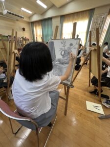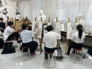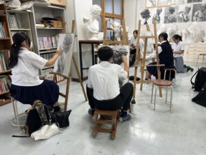 10月18日(土)10月19日(日)に、本校にて宮崎県高等学校美術実技講習会が実施されました。県内の志高い高校生が受講しており、本校からも美術大学へ進学する生徒が参加しました。本校で芸術系に進学する生徒は、平常の授業・学習に加え、美術の先生の指導の下、それぞれの志望に応じて実技等の腕を磨いています。凛とした空気の中、作品と真剣に向き合い、夢を追いかけ自身の高みを目指す生徒たちの姿はとても輝いていました。