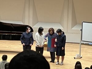 11月30日(日)に、合唱連盟九州支部主催の講習会「レディースカンタートみやざき」に参加しました。講師の三縄みどり先生の美しく高い響きの声に聞き惚れながら、発声の基本や歌唱する際の意識すべきポイントを学びました。たまたま一番前に着席していた本校女子部員が登壇するよう促され、直接指導を受けることができたのは幸運でした。