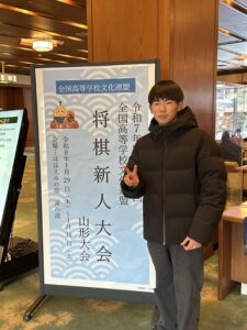 1/30(金)・1/31(土)に第34回全国高等学校文化連盟将棋新人大会が将棋の聖地である山形県天童市で開催され、宮崎県大会で準優勝した本校2年の志賀陸都くんが宮崎県代表として参加しました。各都道府県の予選を勝ち上がってきた参加者と熱い対局を繰り広げました。予選4局とも熱戦でしたが、決勝トーナメント進出とはなりませんでした。将棋の聖地である天童市で全国の仲間と対局できたことは非常に有意義な経験となりました。