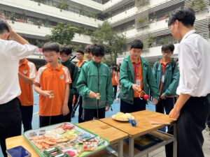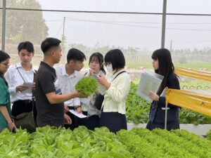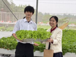姉妹校生活4日目は、インプットとアウトプットの日でした。午前中は、姉妹校生活初日のサイエンスプロジェクトで学んだ”Soilless farming”を実際に見に行きました。ハノイから車で1時間ほど走った、ハイズオン省の農村部に行き、大きなビニールハウスの中で、土を使わずに白菜、チンゲンサイ、レタス、パクチーなどの野菜が栽培されていました。根っこを守るためにココナッツの木を潰したものを苗代にして、直接養分の入った水に浸す農法でした。生徒たちは農家さんのお話を聞きながら、ワークシートのタスクに答えたり、新たに生まれた質問をして理解を深めることができました。