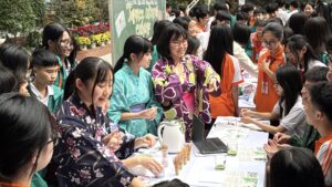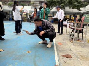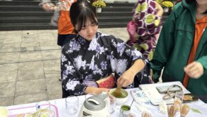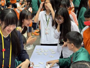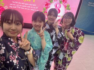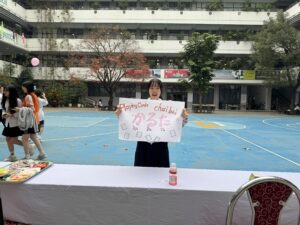 午後は、我々日本の伝統文化をNTTの生徒や先生に伝える時間でした。事前に日本で準備をし、①茶道、②日本の衣装試着、③歌留多、④昭和の遊び、⑤知育菓子の作成体験、の5つに分かれて行いました。時間が来ると、ものすごい勢いでそれぞれのブースにNTT生徒たちが訪れ、興味津々にそれぞれの体験を行なっていました。日本の文化や習慣は知っているつもりでも、外国の文化を知ることで改めて知ることもありました。